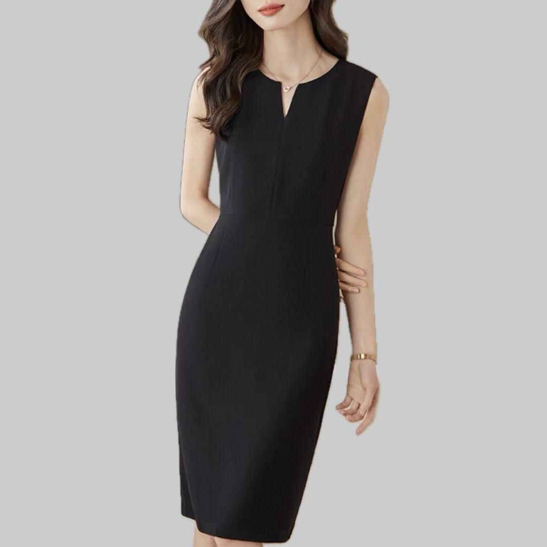 すっきりとしたシルエットが美しい、ノースリーブのタイトワンピース。