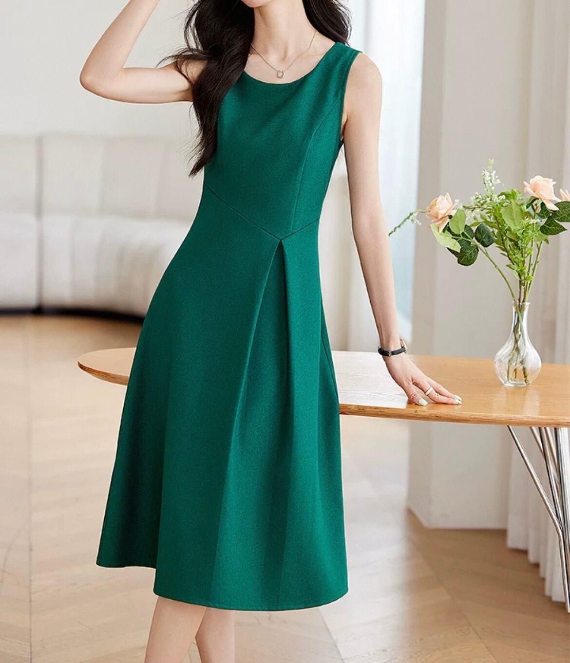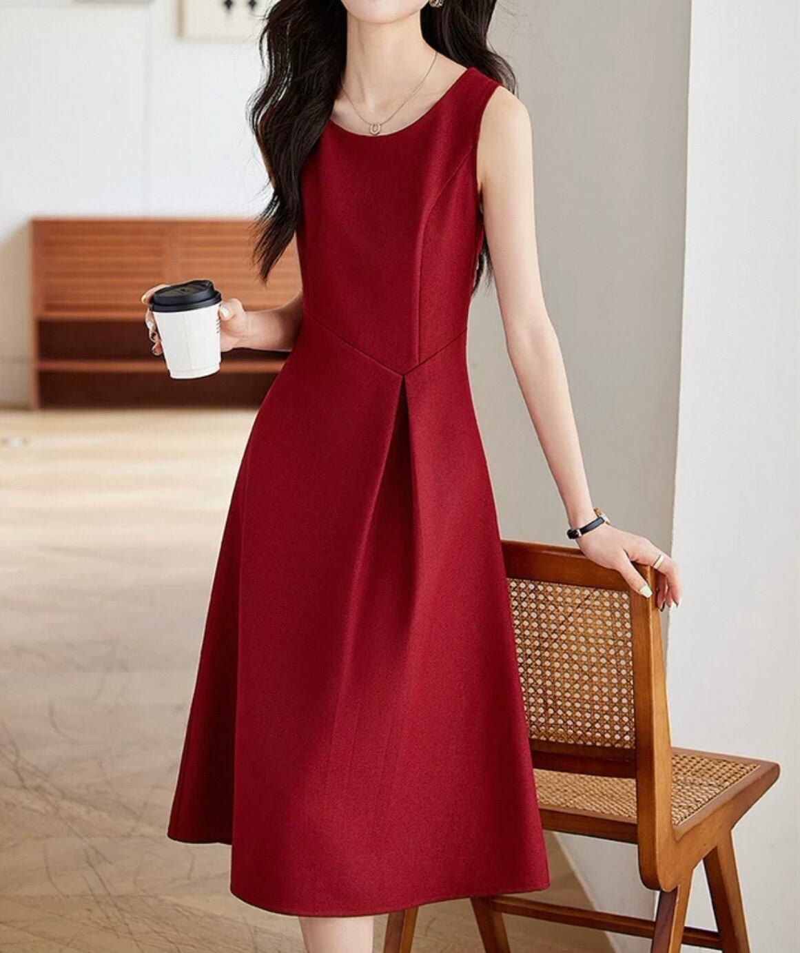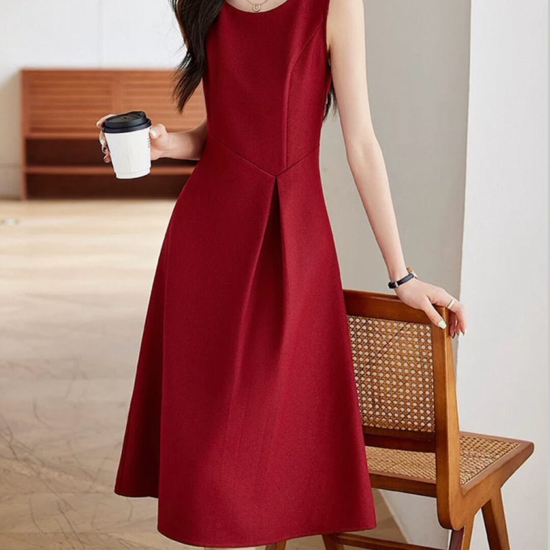上品な印象を与える、ノースリーブのラウンドネックAラインミディアム丈ワンピース。