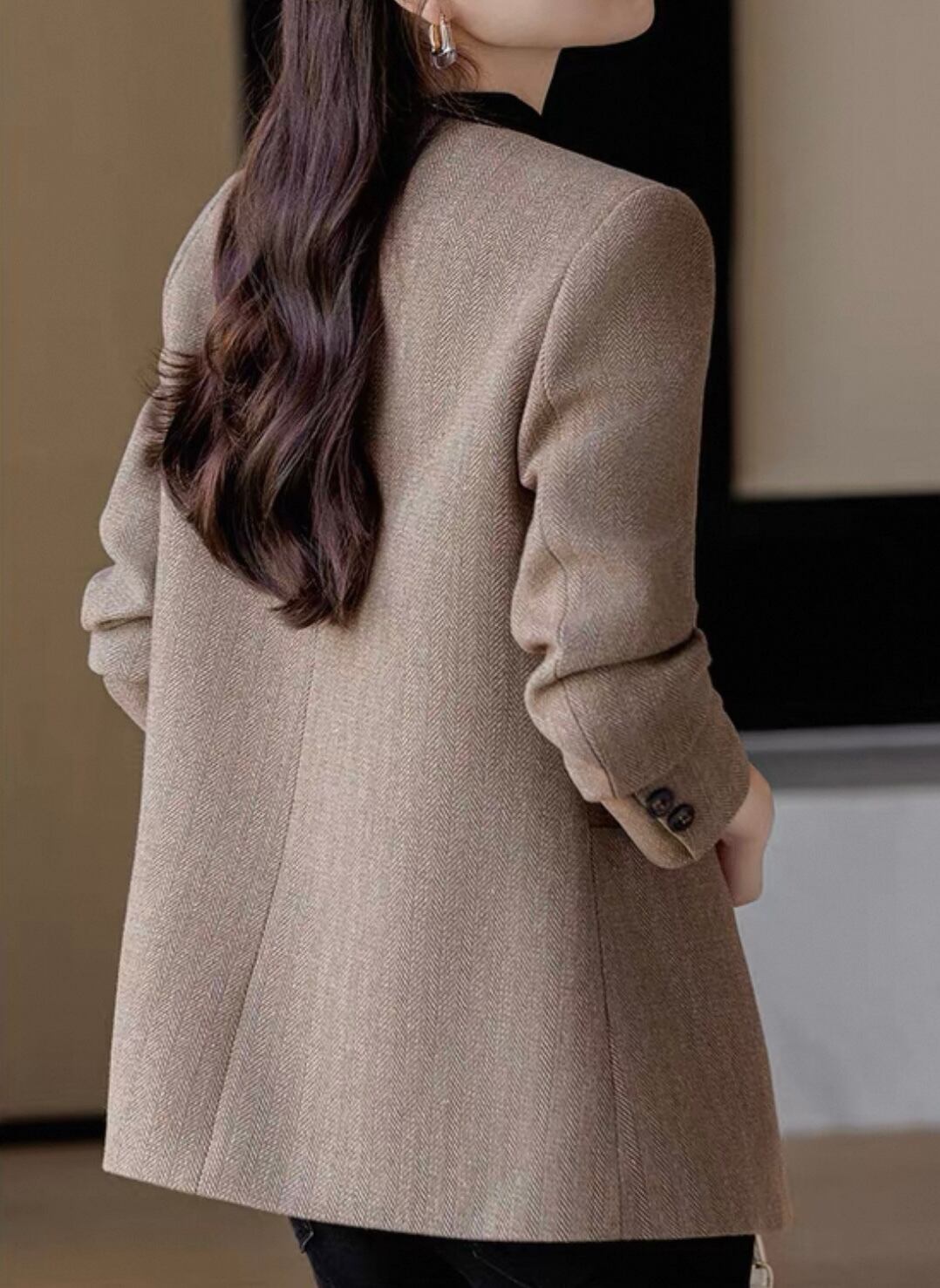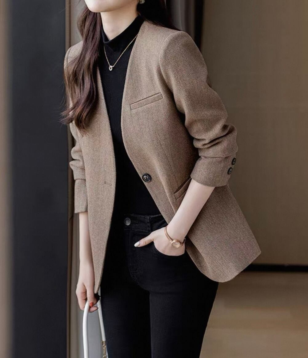 シンプルなシングルボタンデザインで、オフィスシーンからカジュアルな場面まで幅広く活躍します。