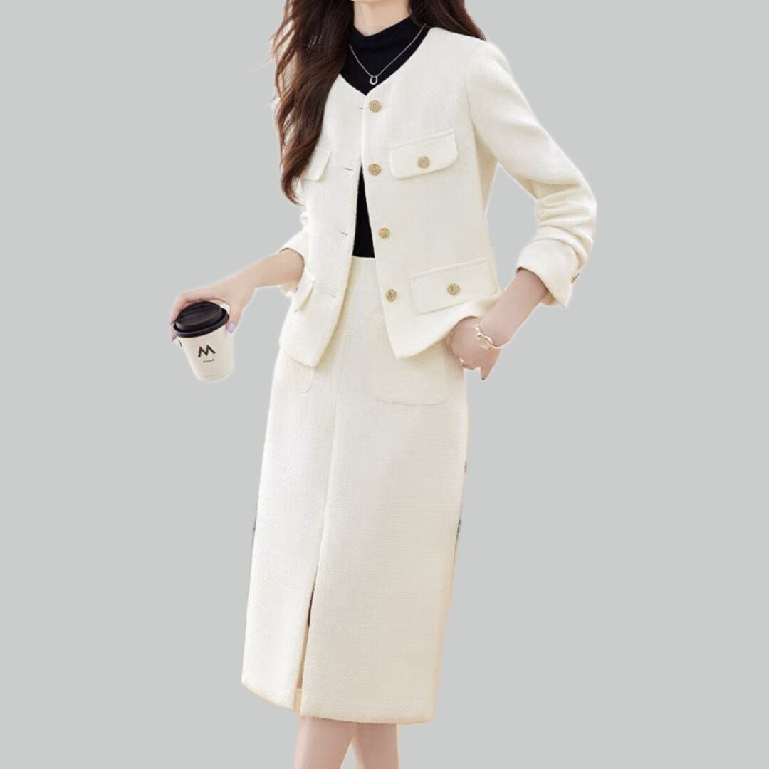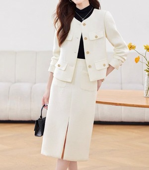 Gold button tweed collarless jacket and tight skirt with slit 00095