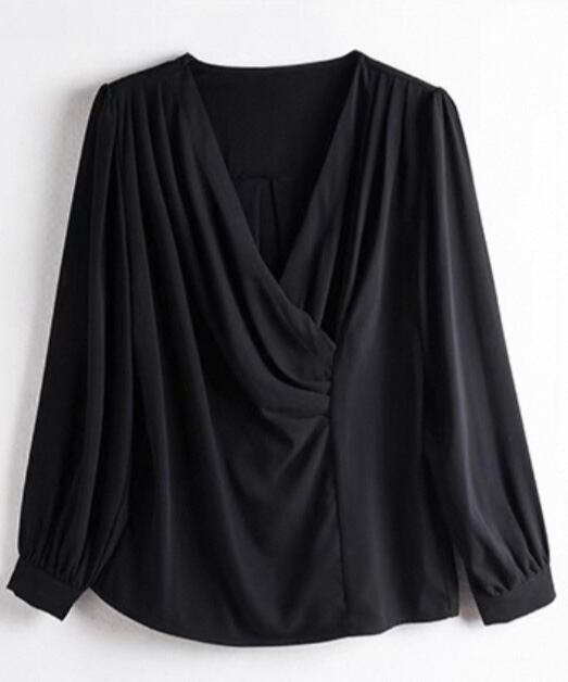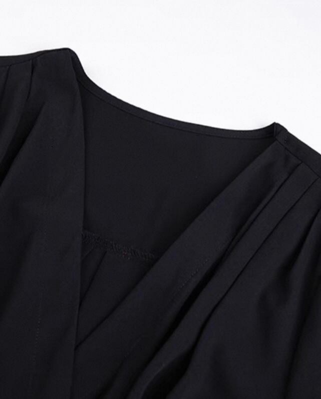 Vネックデザインが女性らしさを引き立て、ラップスタイルが体型をカバーしつつ、すっきりとしたシルエットを実現します。