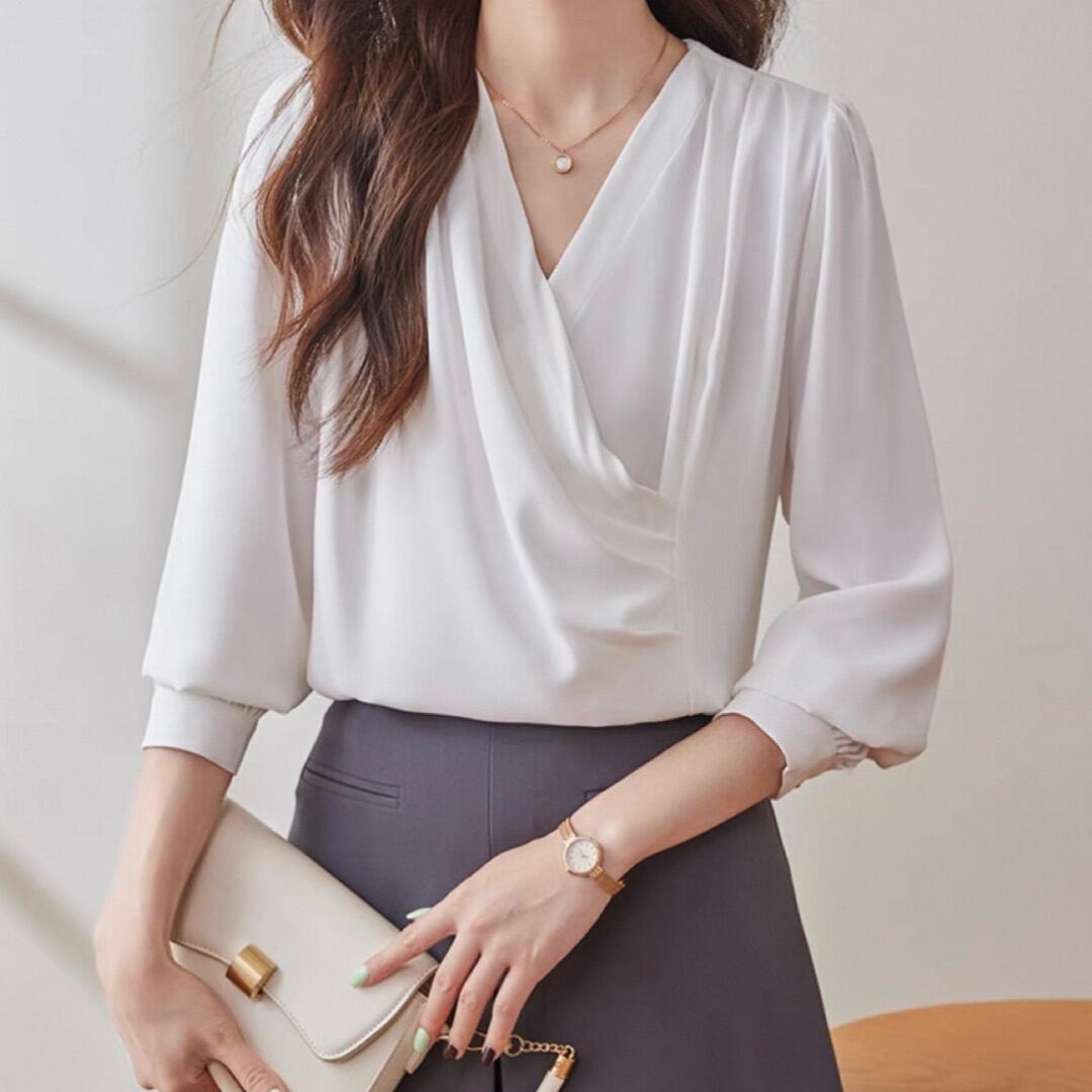 洗練されたデザインと着心地の良さを両立した、七分袖Vネックラップブラウス。