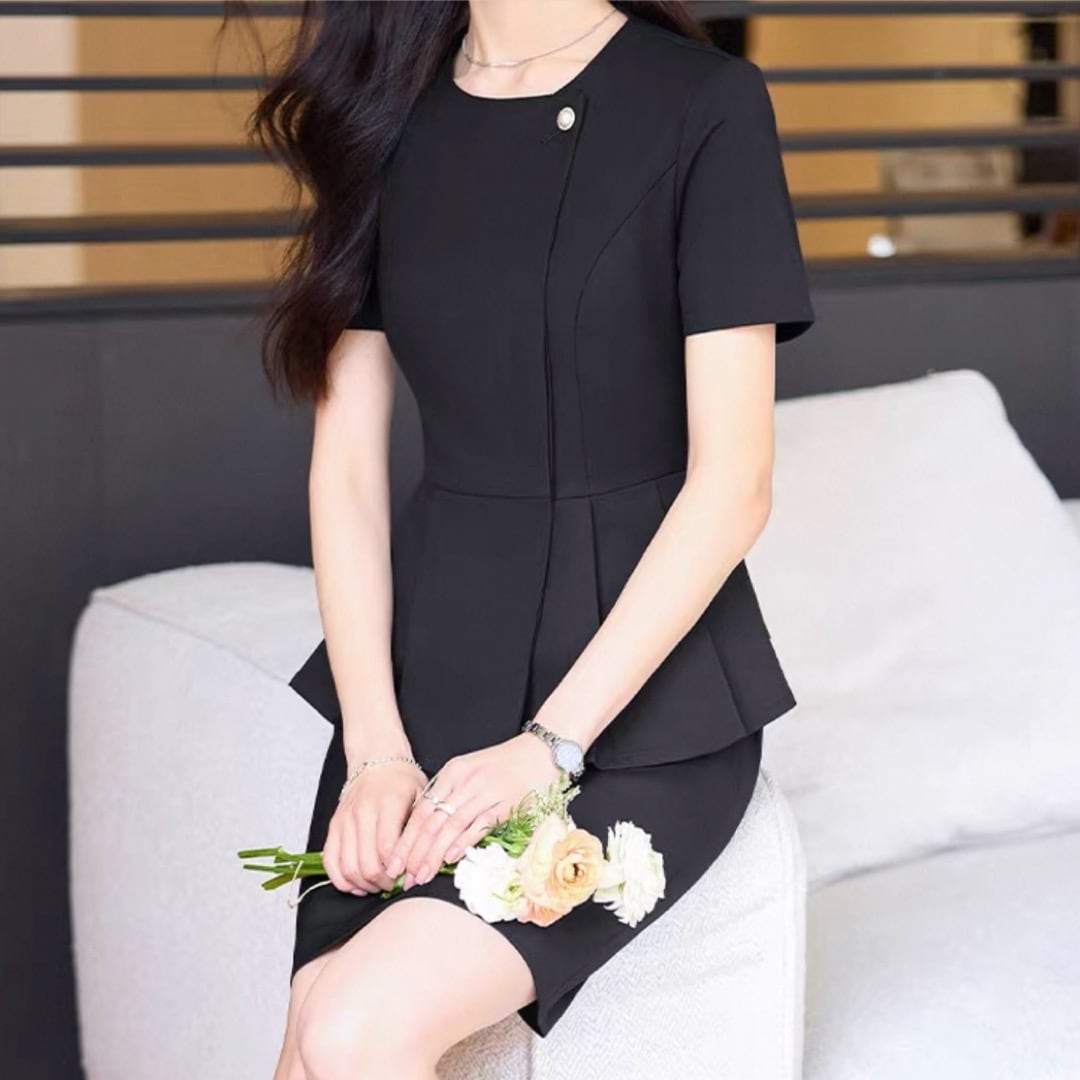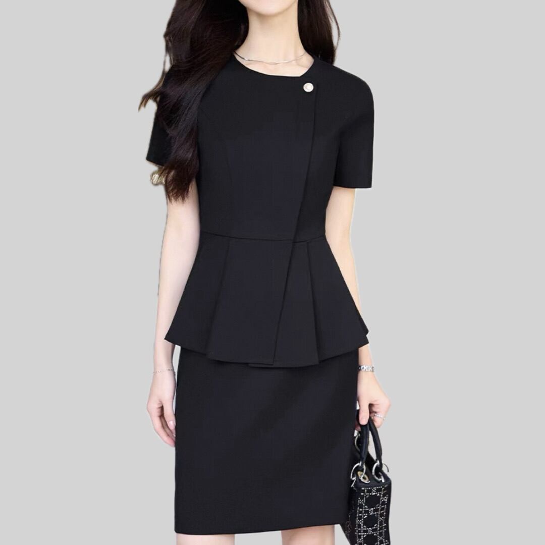 Peplum short sleeve collarless tops and mini skirt setup 00114