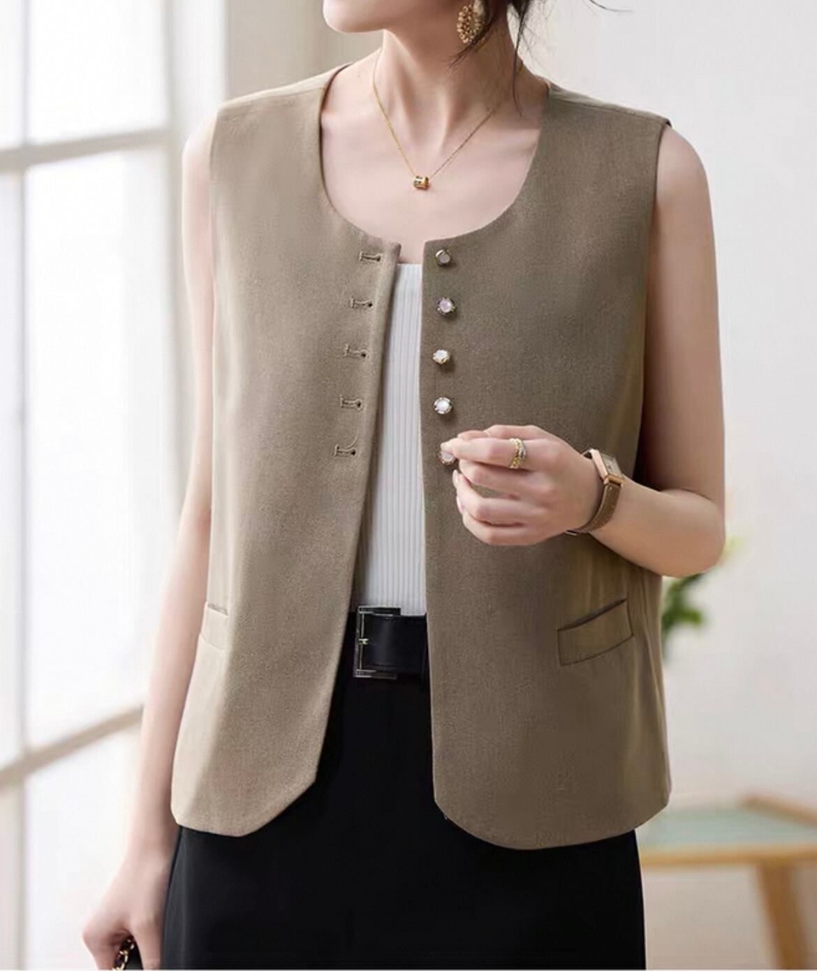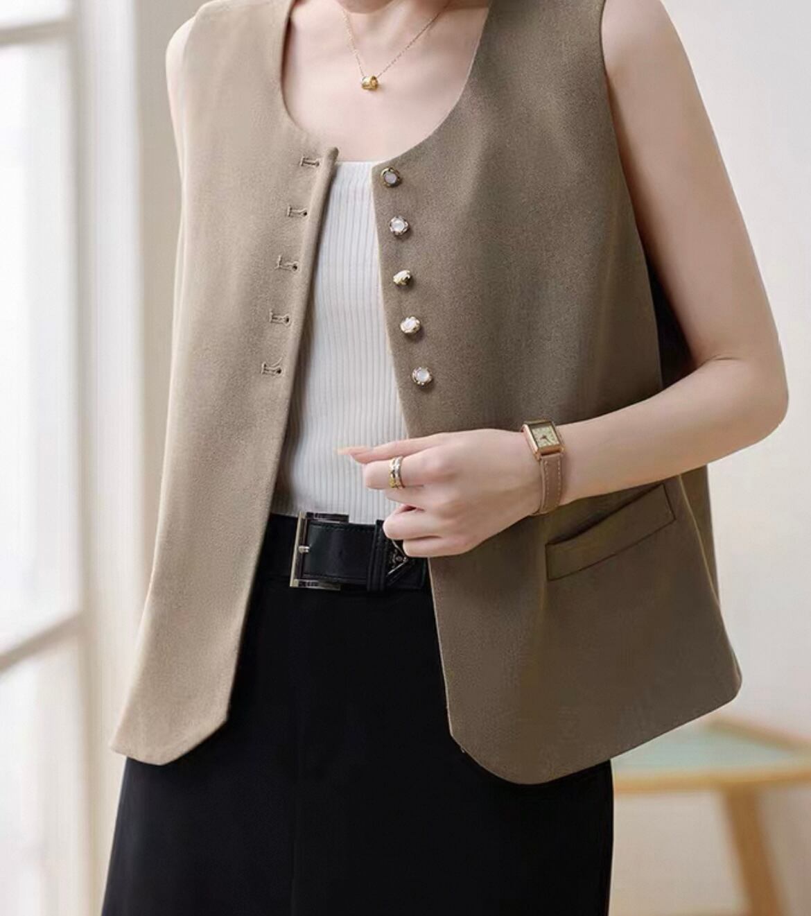 きちんと感とこなれ感を両立したノースリーブシングルボタンラウンドネックジャケット。