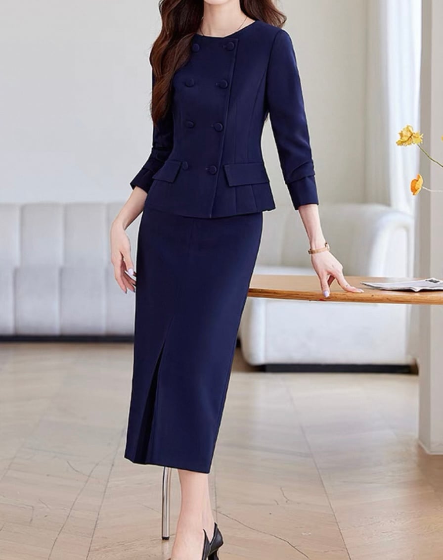 Waist tuck design pea coat jacket and semi flare tight long skirt setup 00121