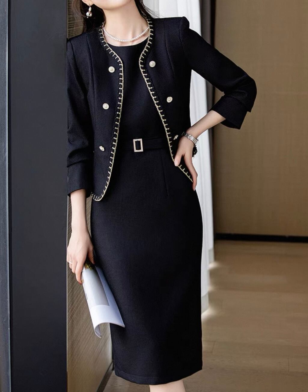 ドレスはベルト付きでスタイルアップ効果も期待できます。