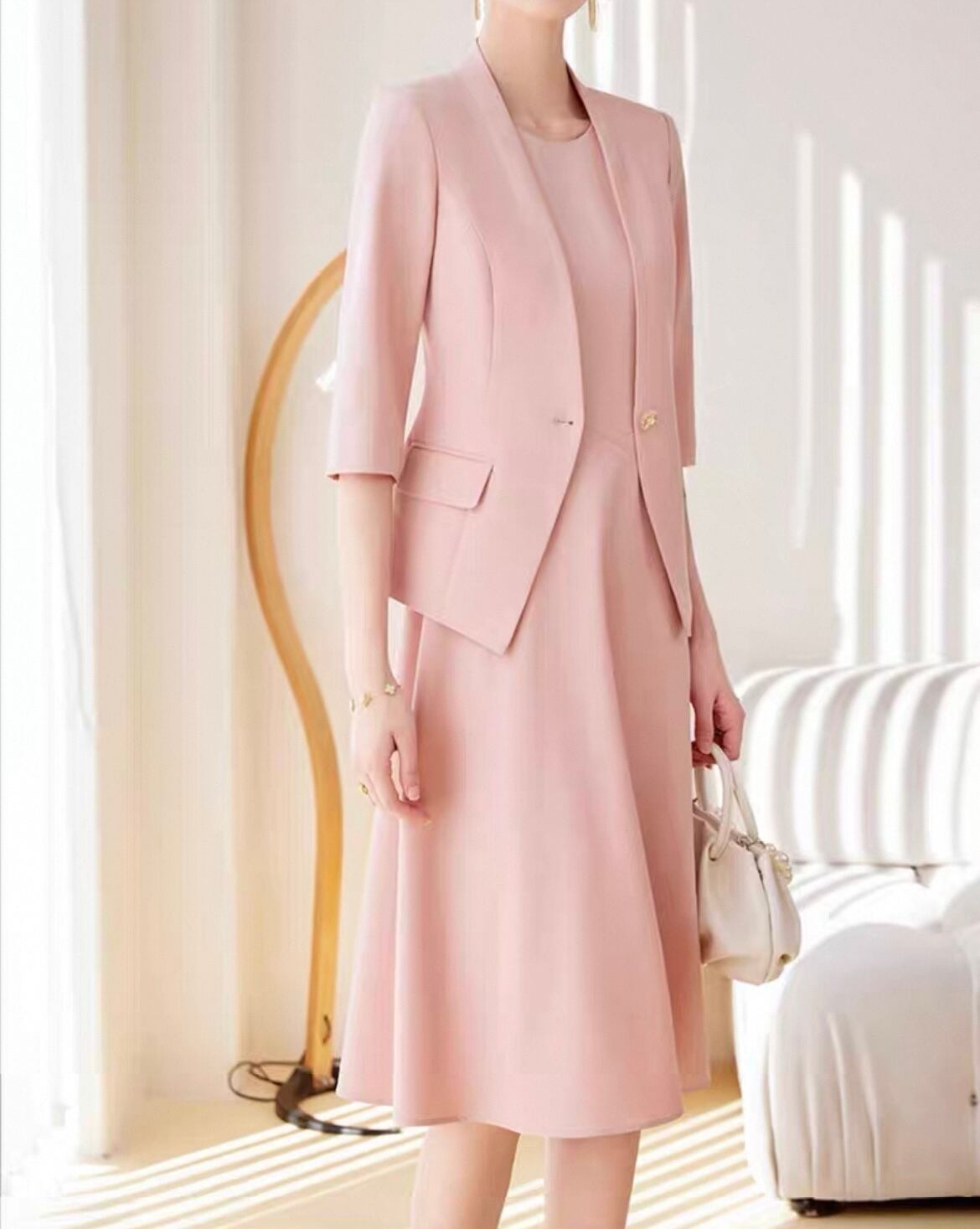洗練された大人の女性を演出する、テーラードカラー七分袖ジャケットとAラインシルエットミディ丈ワンピースのセットアップ。