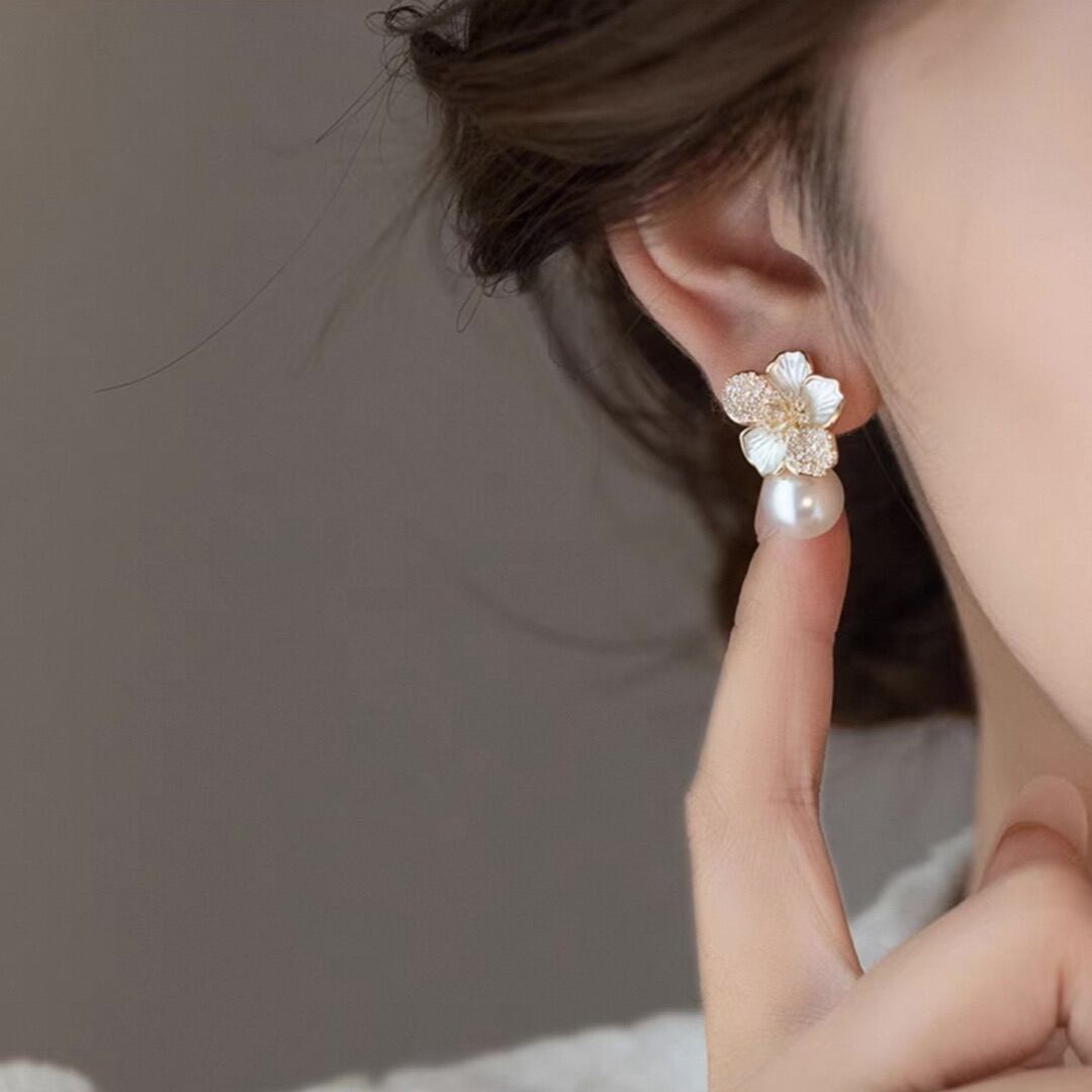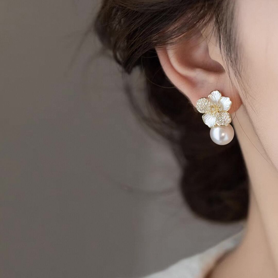 Pave setting flower motif and pearl earring 00135