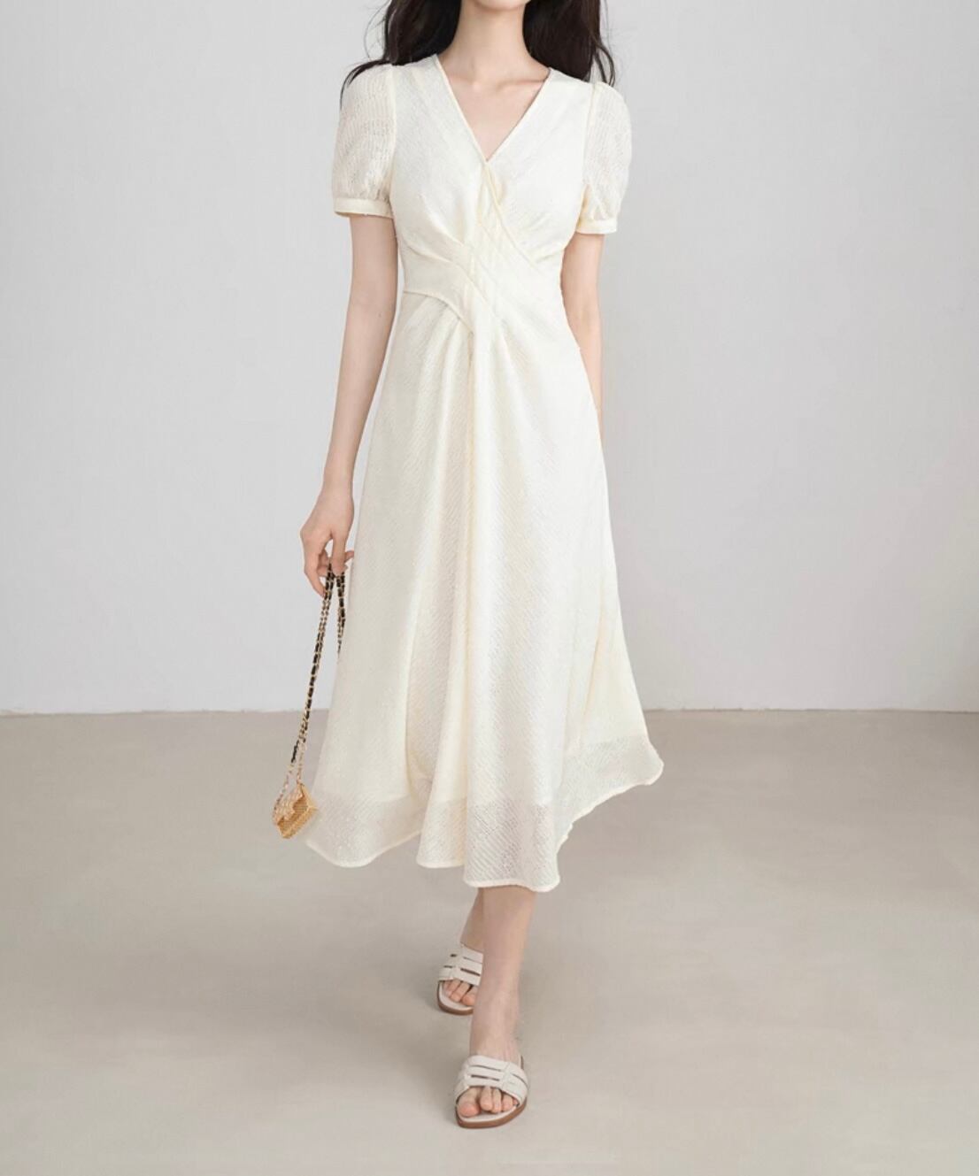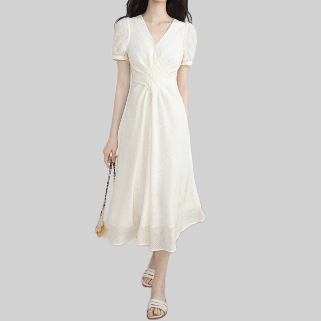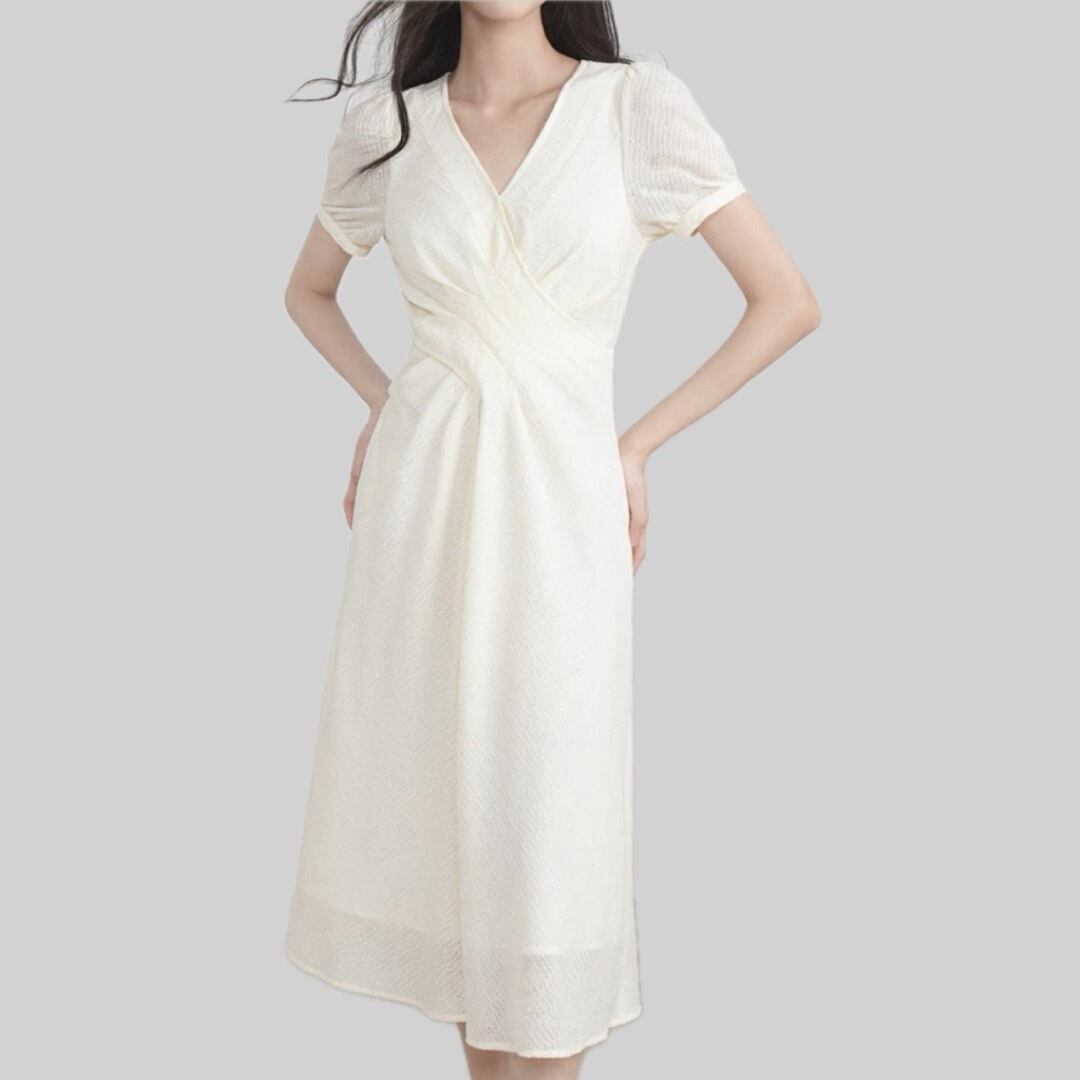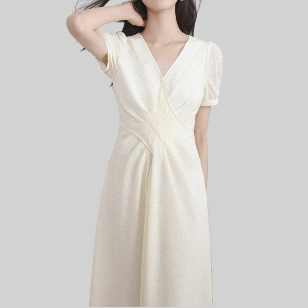 Cream color V neck short sleeve design dress 00153