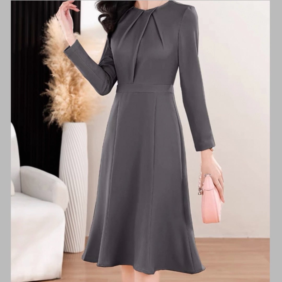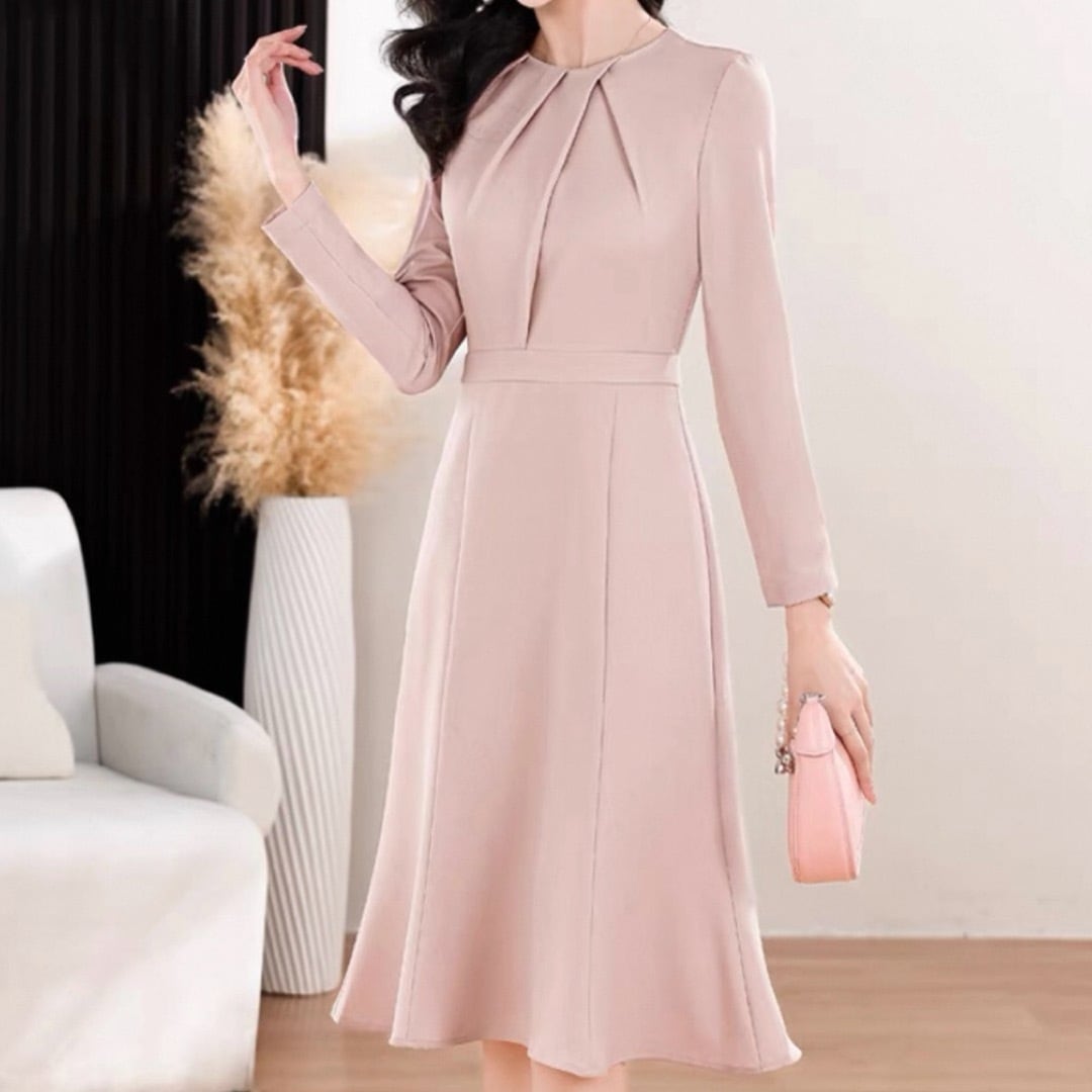 デコルテ部分の切り返しデザイン、フレアスカートがエレガントなドレス。