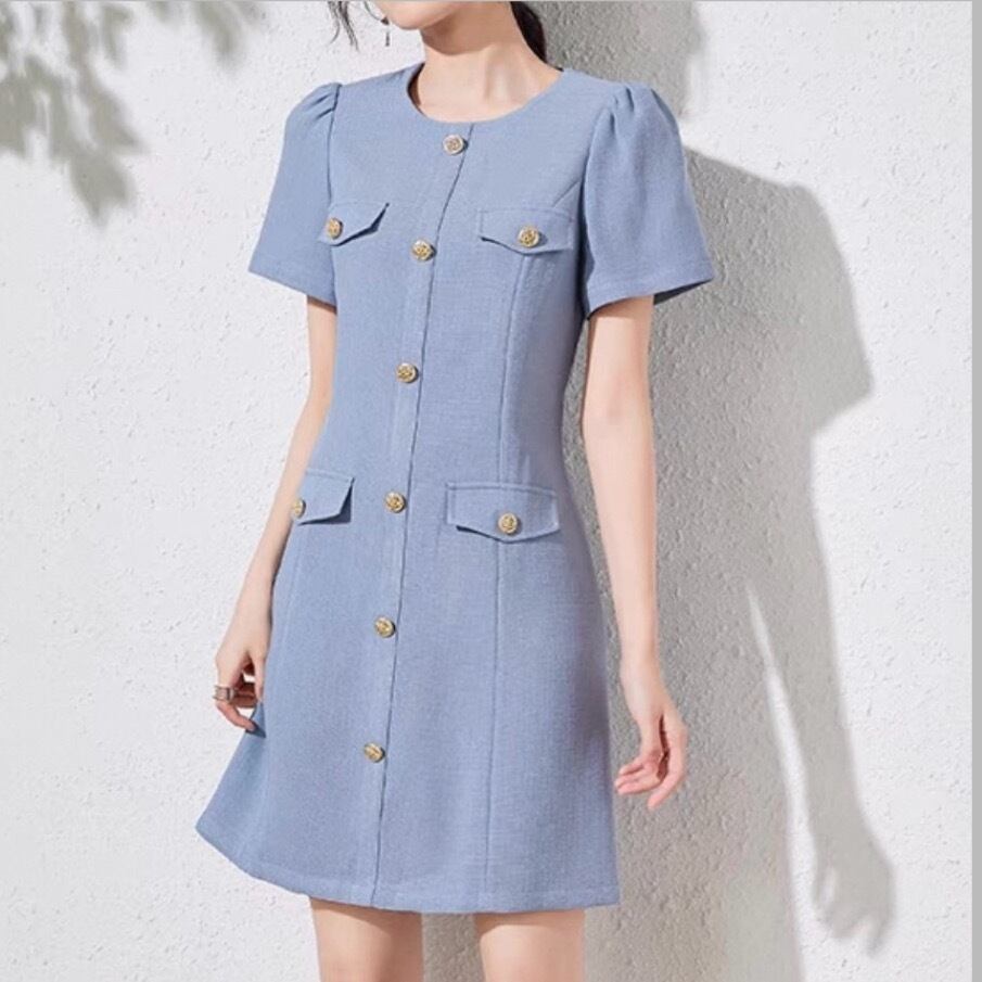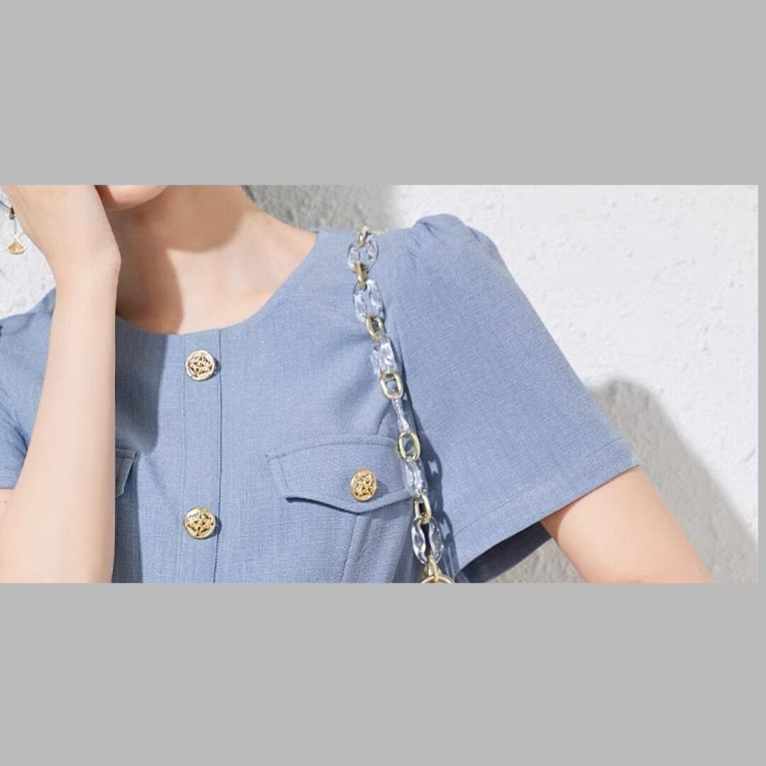 爽やかなブルーにゴールドボタンが華やかなドレス。