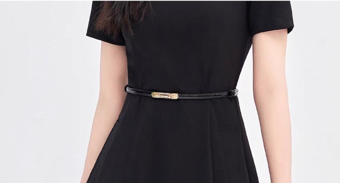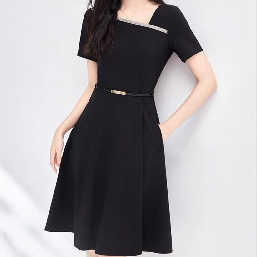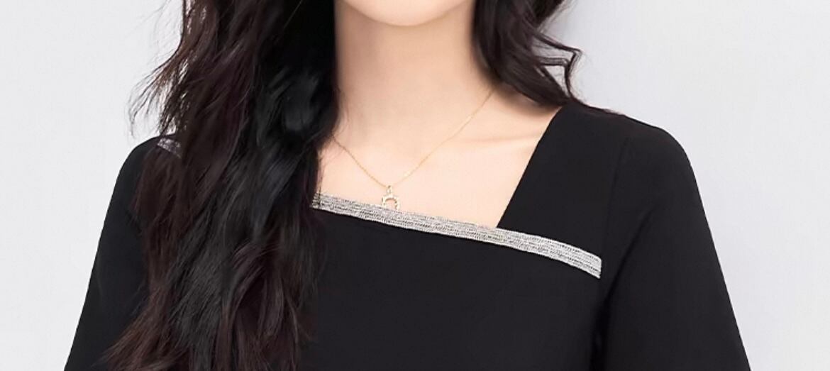 デコルテが斜めにカットされた女性らしいデザインがポイントの1着。