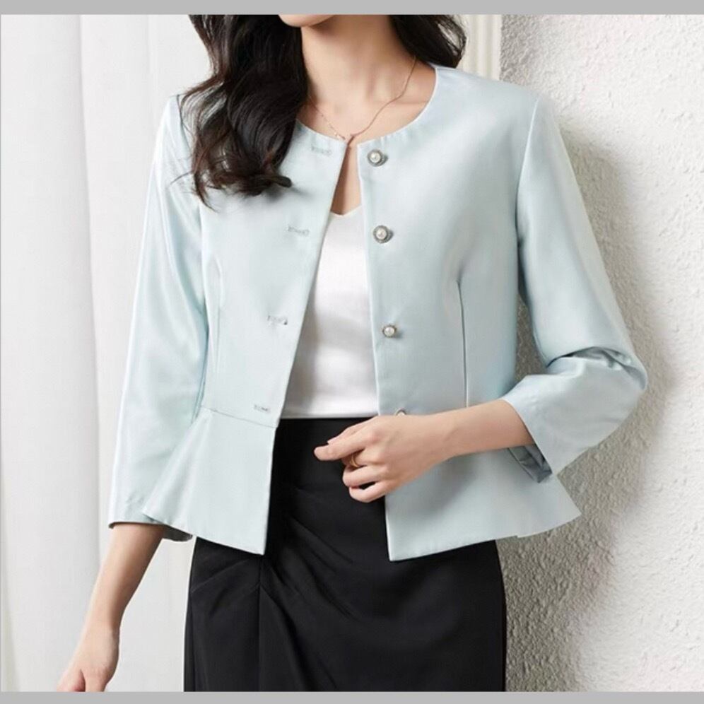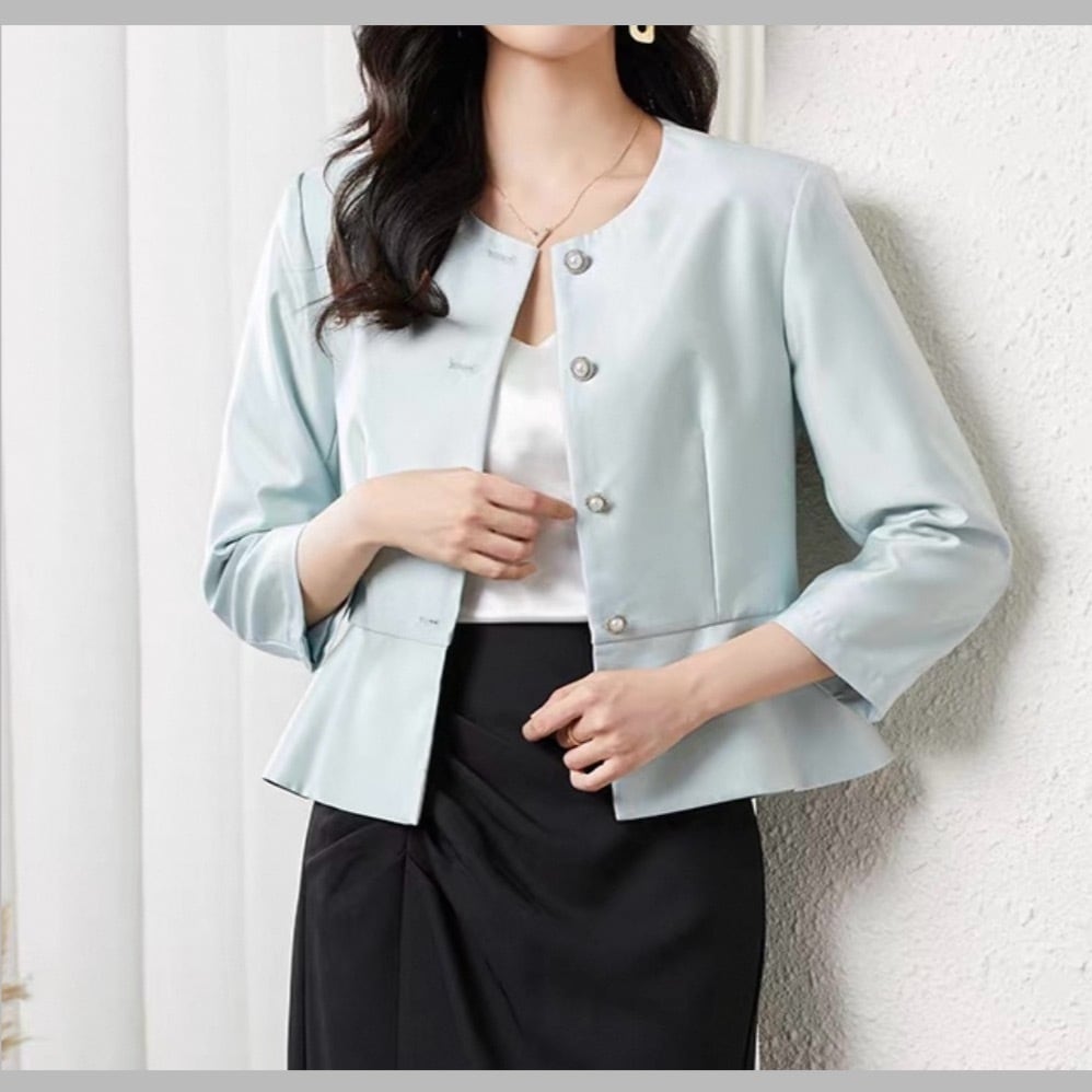 爽やかな印象のライトブルーのカラーリングと裾がペプラムになっておりエレガントなジャケットです。