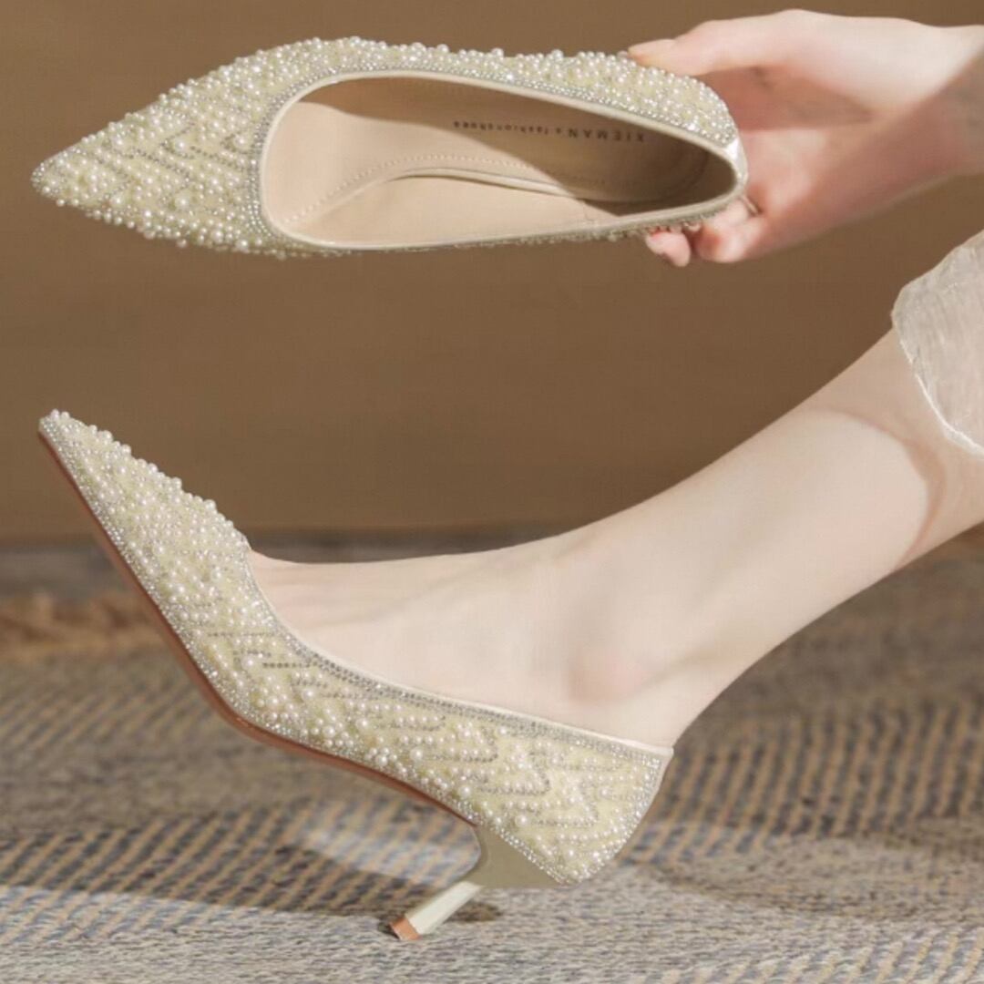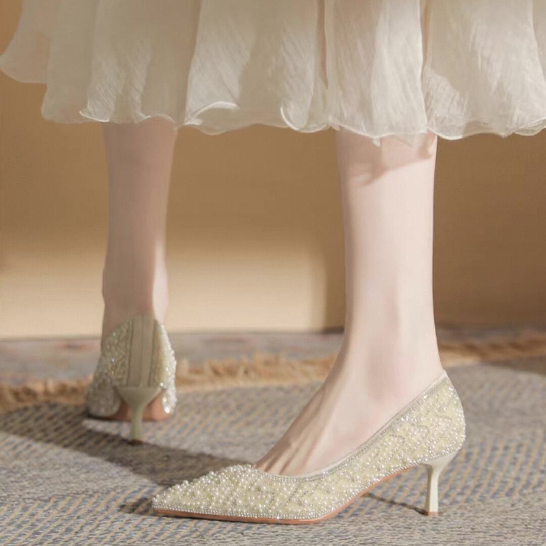 パールモチーフでデコラティブなデザインが華やかさと落ち着きを持つパンプス。