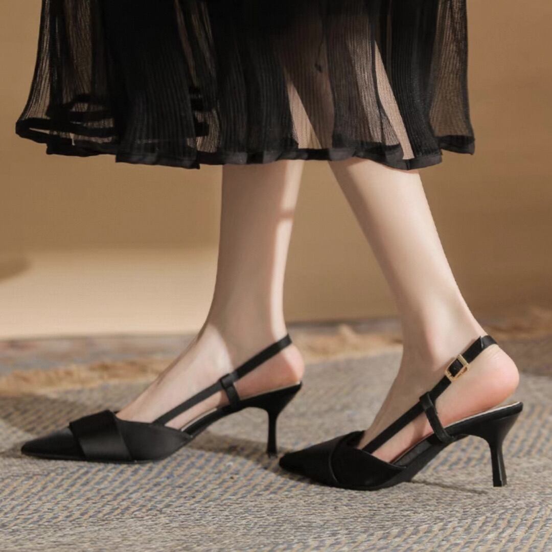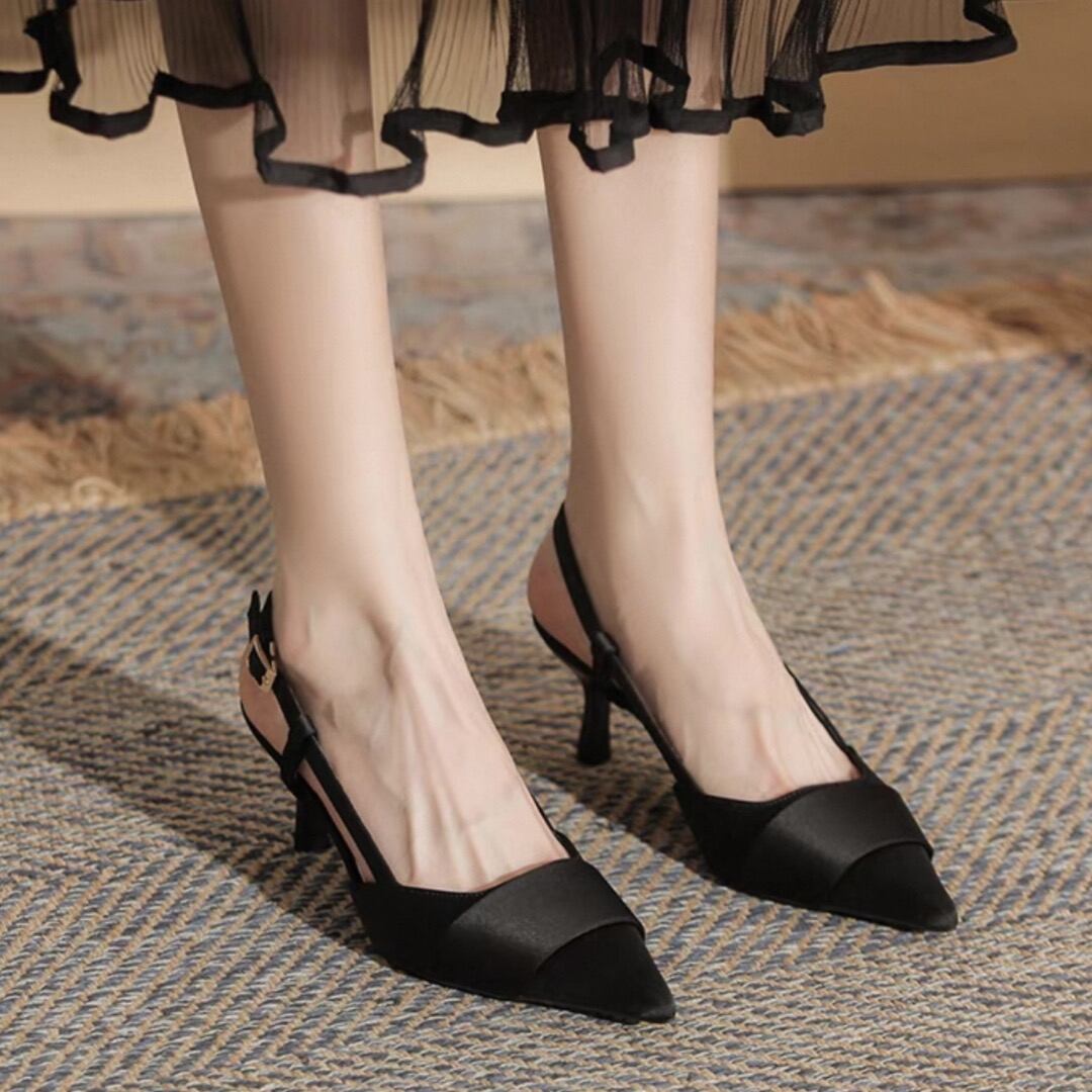 華奢なピンヒールとシャープなポインテッドトゥが、足元を美しく魅せるサテンパンプス。