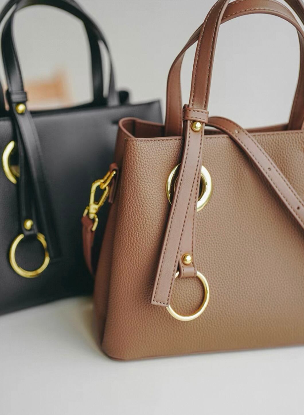 ゴールドの飾り金具がポイントのトートバッグ。