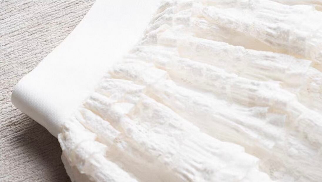レースが段々に折り重なるデザインがとても女性らしい1着。