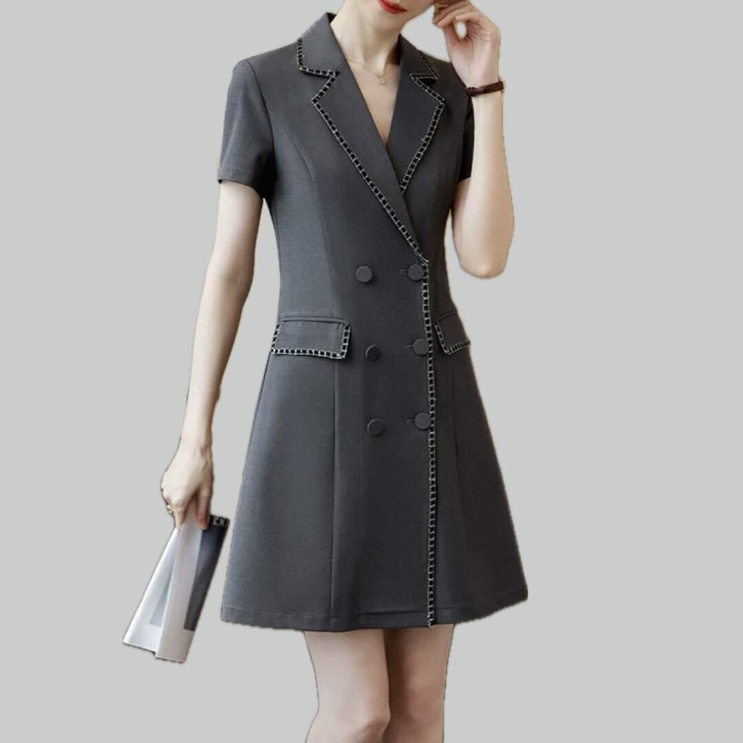 上品なステッチが施されたダブルのジャケットスタイルドレスです。