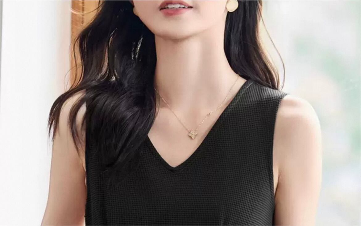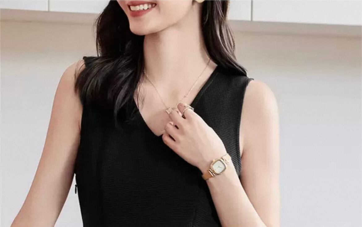 潔くヘルシーな胸元のVカットデザインとフレアスカートがなんとも女性らしいシルエット。