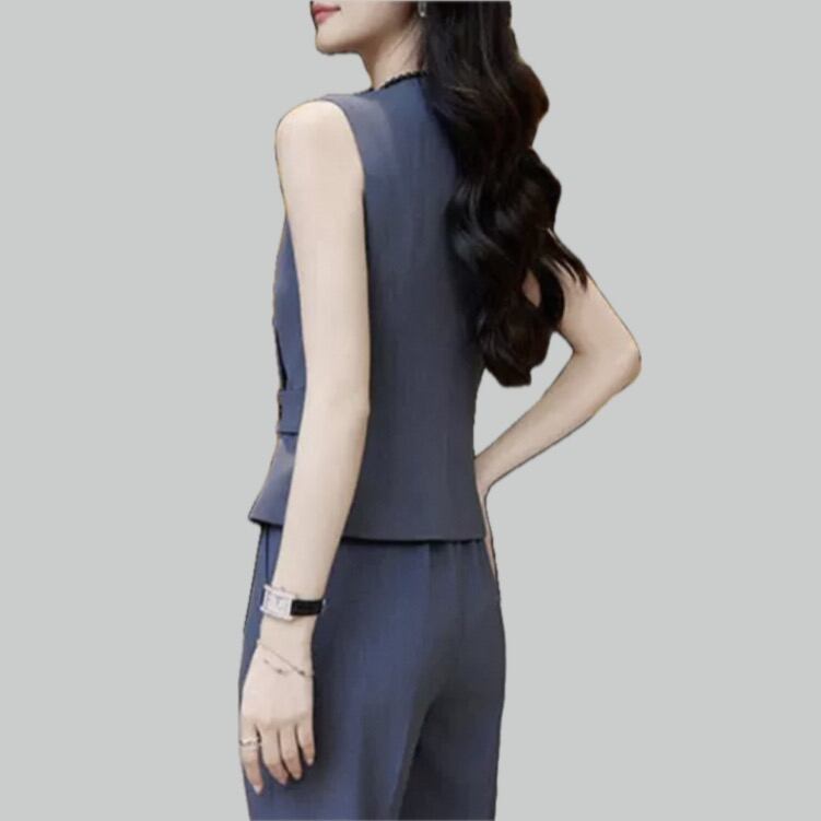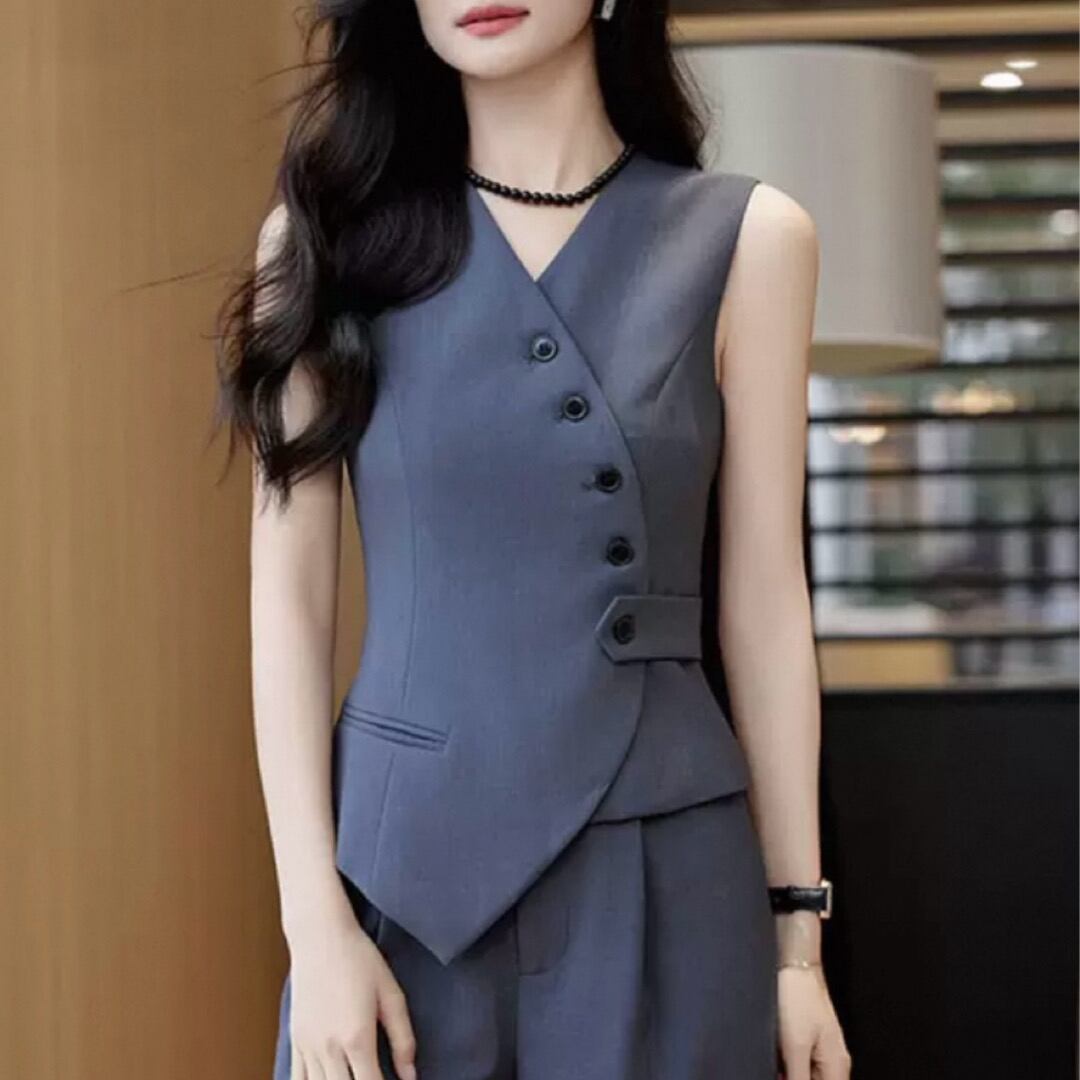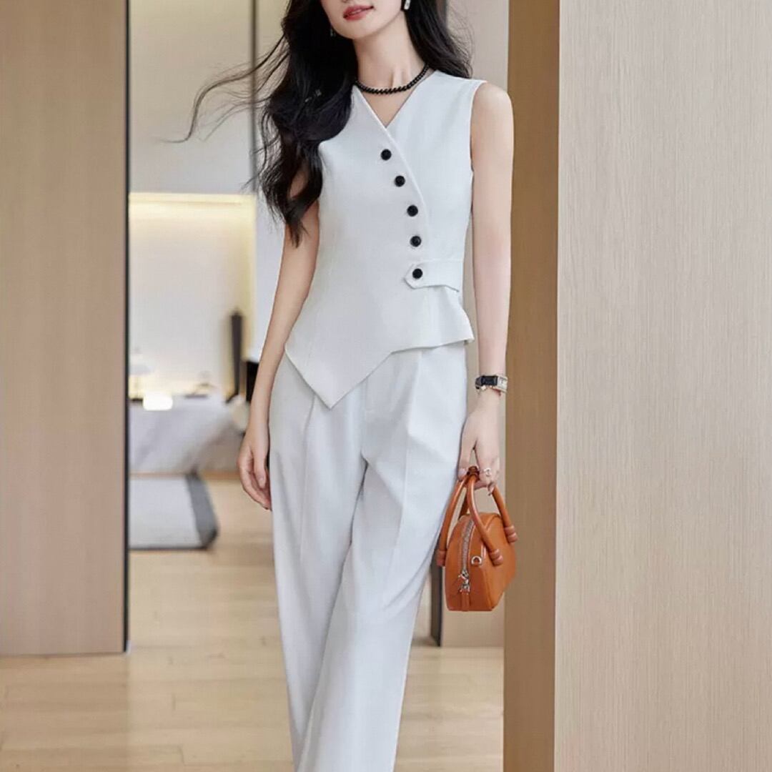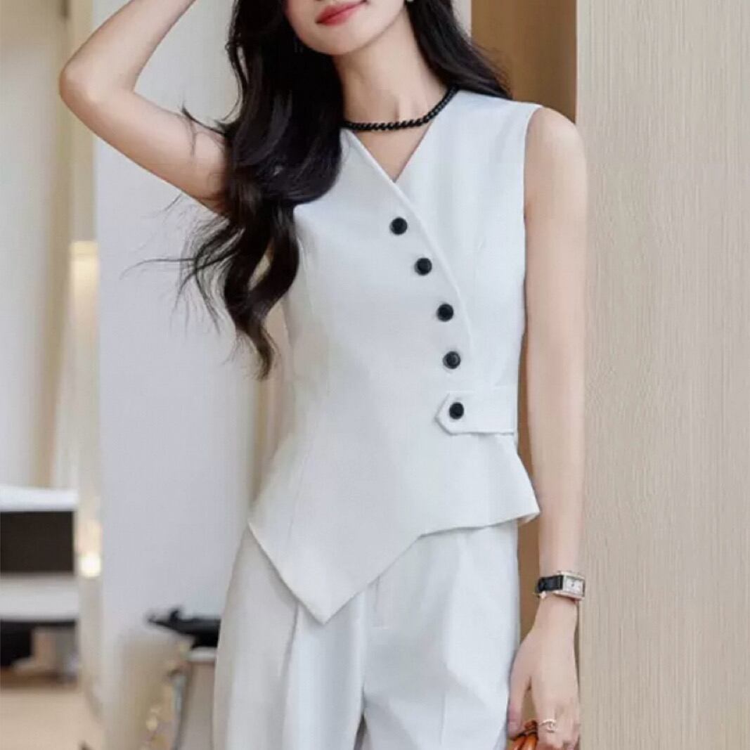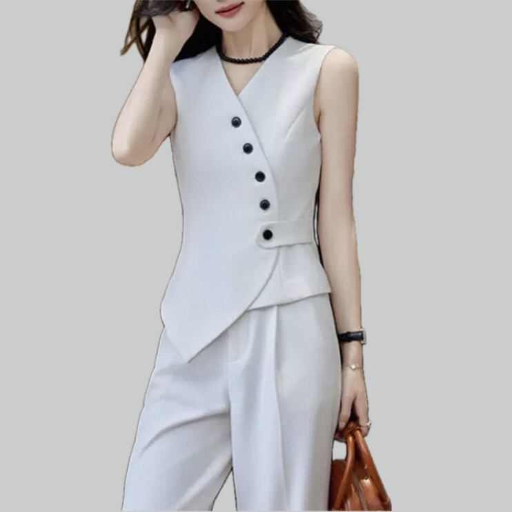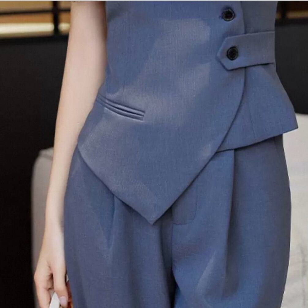個性的かつスッキリとした印象の曲線美が美しいトップスに、フロントにダーツが入ったパンツ。