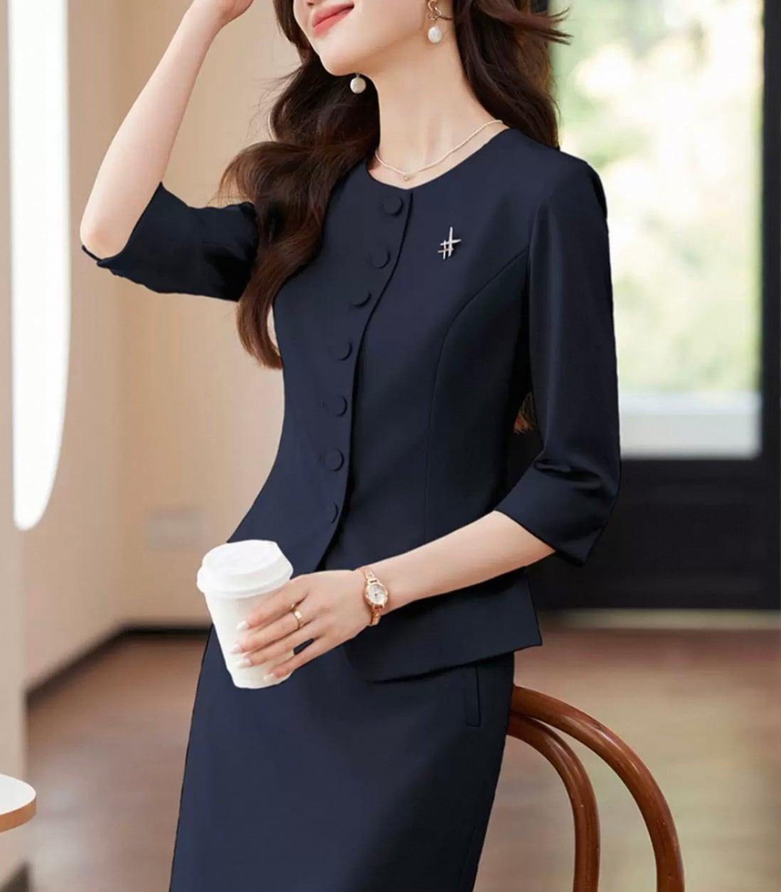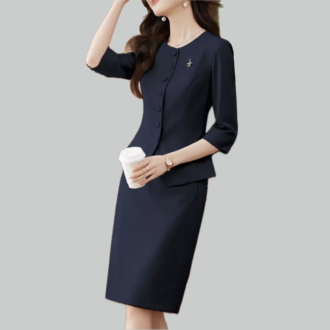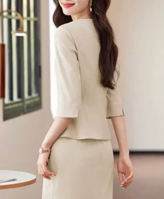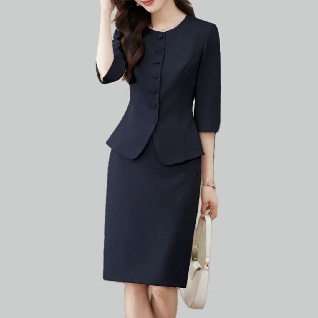 Fabric covered button collarless waist jacket and pencil skirt setup 00080